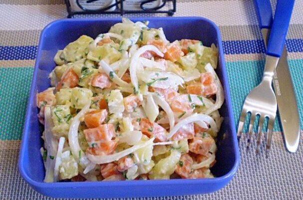 Простий і ситний салат з доступних продуктів, які завжди є під рукою. Овочі спочатку відварюються, потім нарізаються кубиками і заправляються сметаною або майонезом.