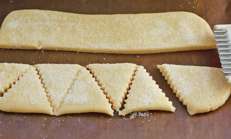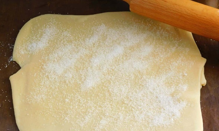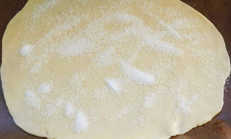 Дістаньте тісто з холодильника та розкачайте у пласт товщиною 3–4 мм. Посипте ¼ частиною цукру і злегка притисніть качалкою, щоб цукор увійшов у тісто.