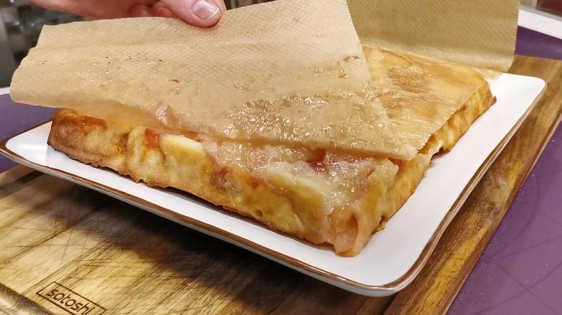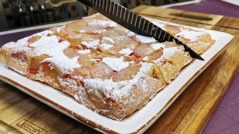 Пиріг виходить дуже соковитим і вологим: тонкий шар тіста знизу та велика кількість ніжних, майже прозорих яблук зверху. Він не лише смачний, а й виглядає по-справжньому ефектно.
