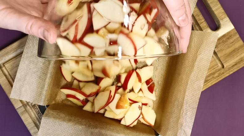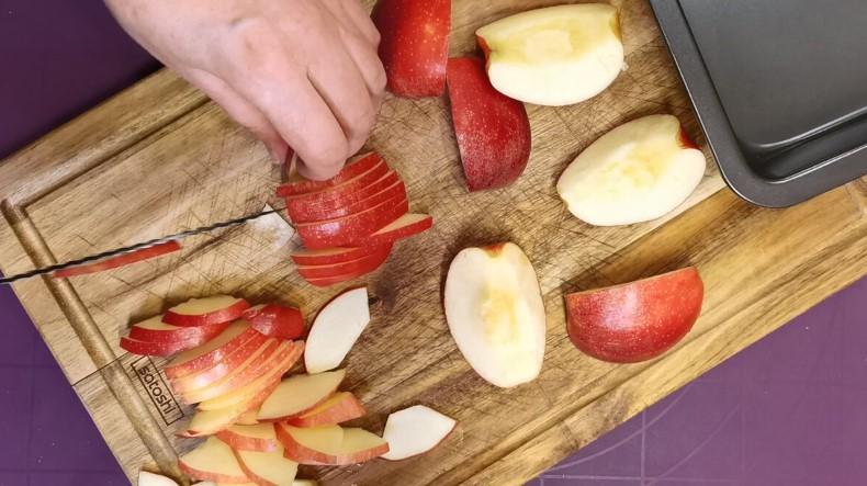 Яблука розріжте на четвертинки, видаліть серцевину та наріжте дуже тонкими пластинками.