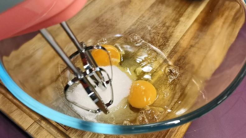 В окремій мисці збийте яйця з цукром міксером або віночком приблизно 1 хвилину, доки маса не стане світлою та трохи пишною.
