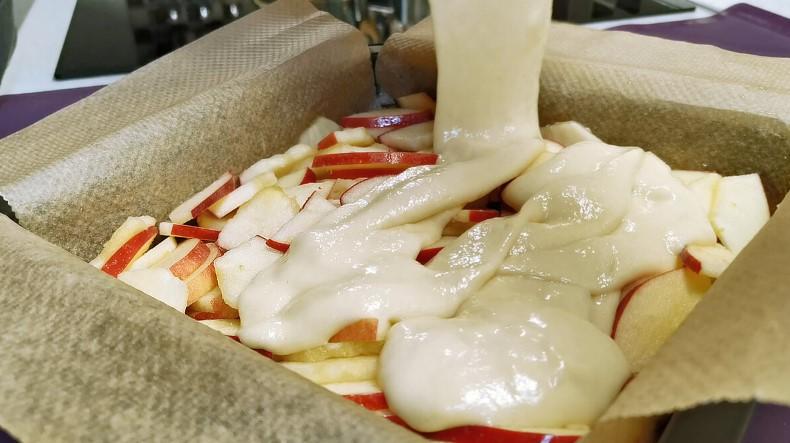 Залийте яблука тістом і злегка потрясіть форму, щоб тісто рівно розподілилося зверху.
