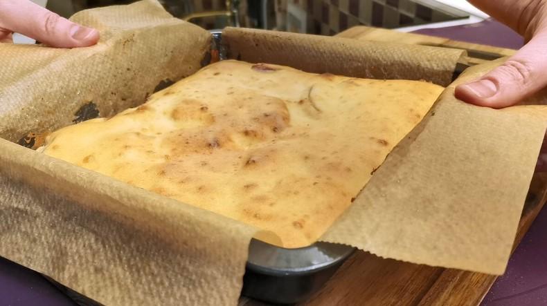 Готовий пиріг дістаньте з форми разом із пергаментом і дайте трохи охолонути.