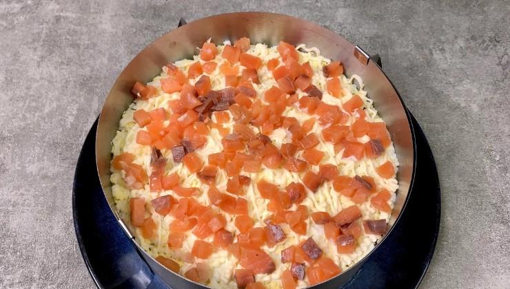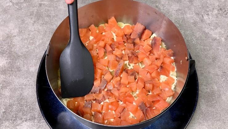 Наносимо останній шар майонезу, а зверху викладаємо кубики червоної риби як фінальний шар.