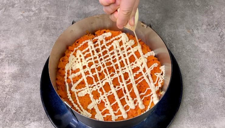 Розподіляємо натерту варену моркву, збризкуємо лимонним соком, трохи солимо і знову наносимо тонку майонезну сіточку.