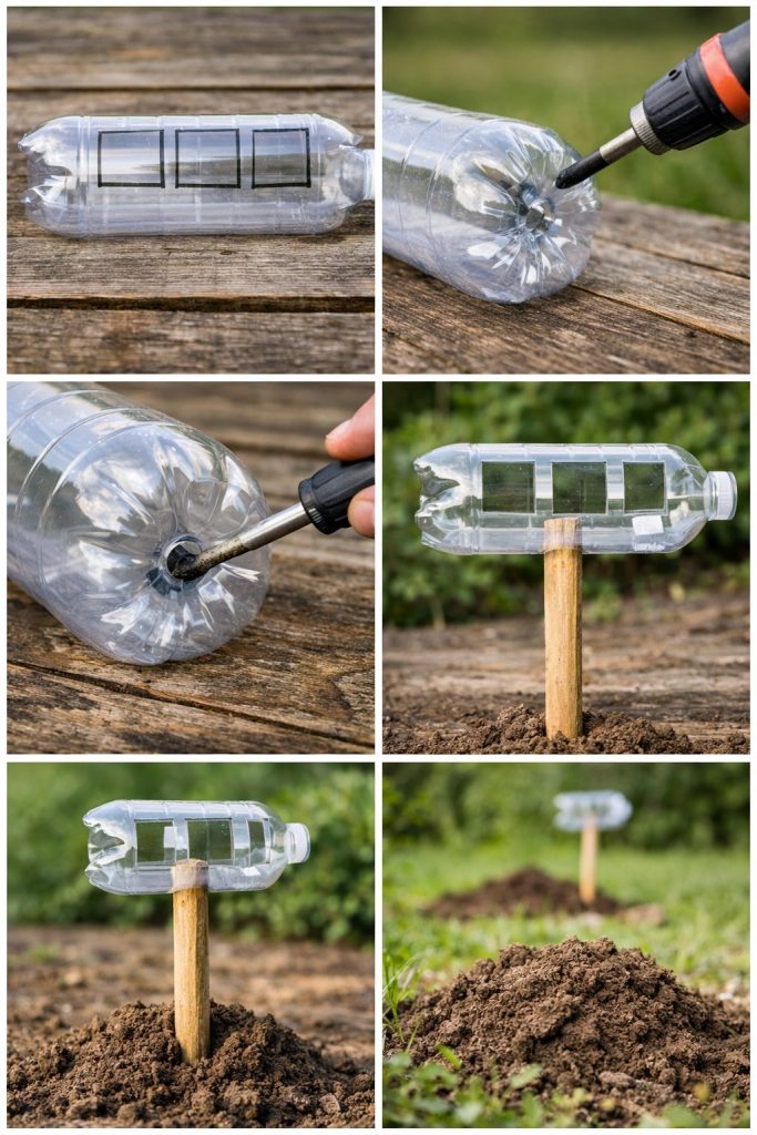 6️⃣ Закріпіть конструкцію в землі поруч із кротовиною або приблизно кожні 8–10 метрів.