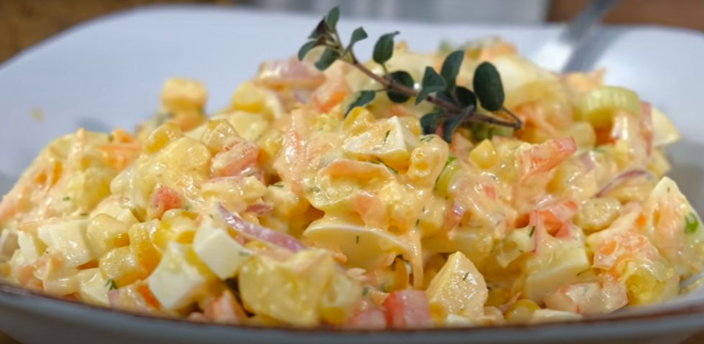 Таку смачну страву, можна навіть використовувати як гарнір до м’ясних закусок, настільки ситний салат виходить за рахунок картоплі та кукурудзи. Можна заправити лише майонезом, якщо не любите смак сметани чи йогурту.