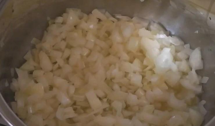 У добре розігрітий казан або сотейник влити олію. У розігріту олію покласти цибулю і обсмажувати її 5-7 хвилин до напівготовності.