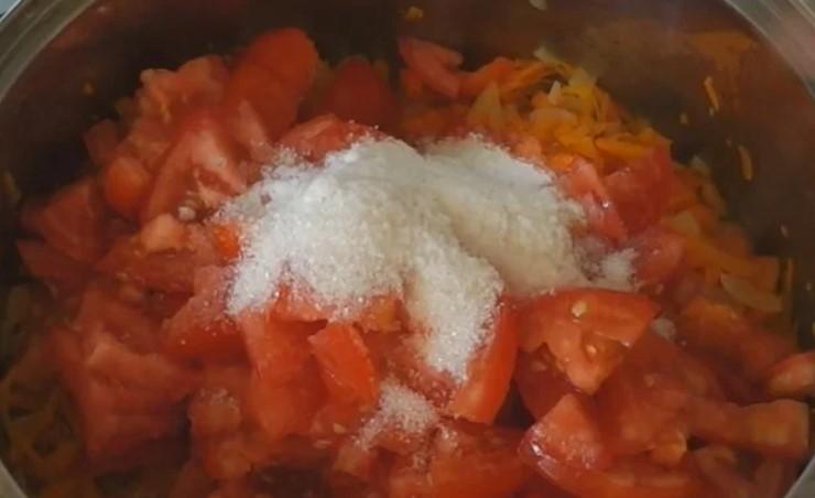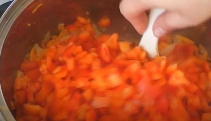 Далі до обсмаженої цибулі та моркви додати болгарський та гострий перці.